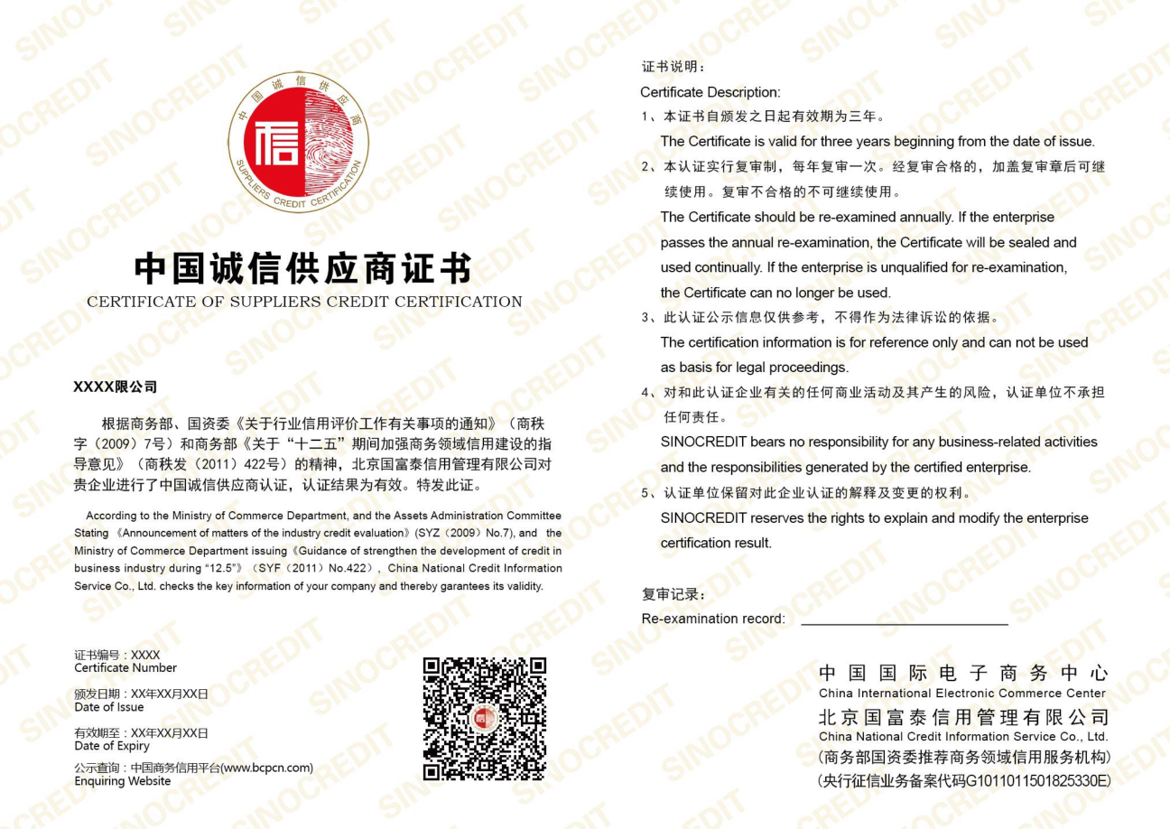 | 信用证书 | 信用证书是企业在中国商务信用平台上的诚信名片,分电子版和纸质版两种。电子版认证证书用于企业在自身网站及中国商务信用平台上的诚信形象展示;纸质版证书可用于企业宣传。信用证书具备证明和查询功能。 |